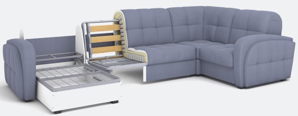 Огромный выбор размеров и типов модулей позволяет составить диван для любого помещения. На диване удобно сидеть и спать: механизм аккордеон при раскладывании образует высокое ровное спальное место, по комфорту сравнимое с настоящими кроватями. Все модули могут быть исполнены с матрасами ППУ или НПБ высотой 12 см (исключение угловая секция — только с НПБ).