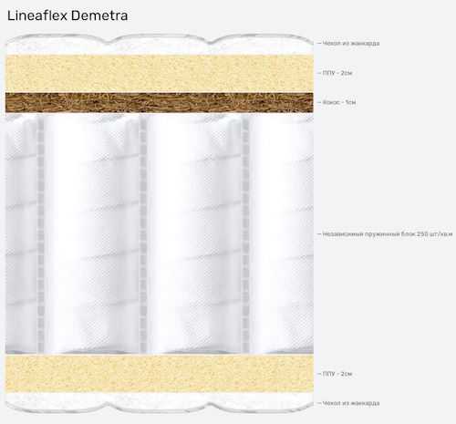 Матрас Demetra с разной жесткостью сторон. Он создан на основе армированного блока независимых пружин MAGNIFICA, в котором на одно спальное место приходится 500 пружин. Каждая пружина находится в индивидуальном чехле и точечно подстраиваются под контур тела спящего, обеспечивая правильную поддержку позвоночника.